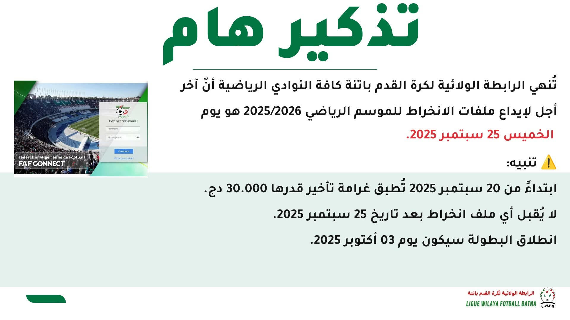 2018 - 2025 Ligue Wilaya de Football - Batna.